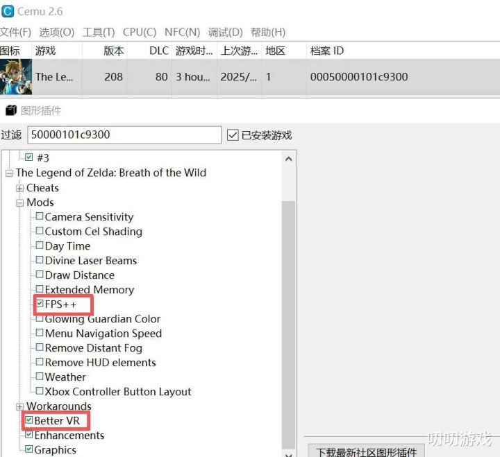 5、它会自动启动Cemu, 先别着急运行你的游戏,在游戏图标上单击右键,选择编辑图形插件,把Mods下面的“FPS++”和Workarounds下的“Bettr VR”勾选上,在Graphics中选择适合你的画面分辨率。