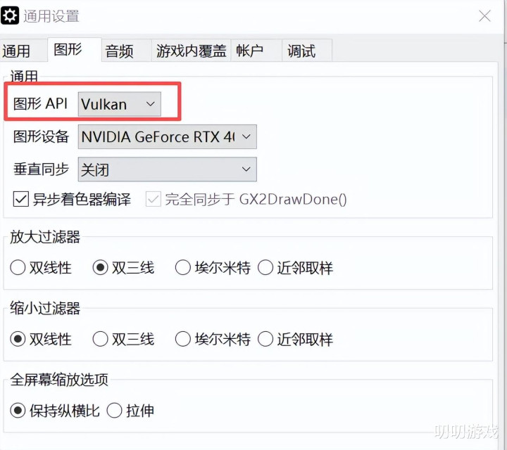 3、继续选择通用设置/图形,API选择“Vulkan”,图形设备选择你的独立显卡,不了解的不要动它;