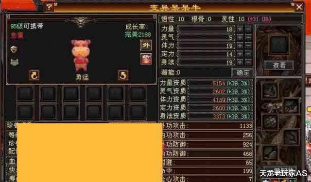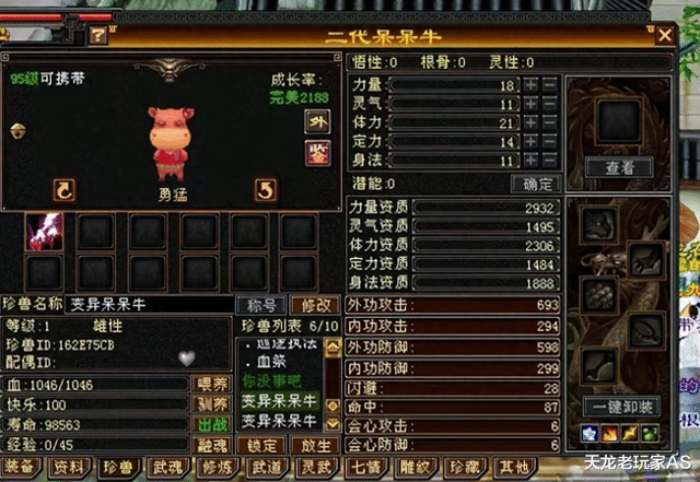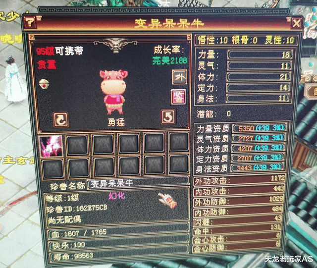 实际长这样:双十资质达到5154! 目前卖上几万高价的的宝宝确实也有,不过绝大部分都是带着高级兽灵。像这样一个仅仅双十的宝宝,就能卖出8.8万的高价,实在不多见。 不过这绝对不是全服第一呆呆牛,如果小编没记错的话,怀旧目前第一呆呆牛在【天下第一】服务器:
