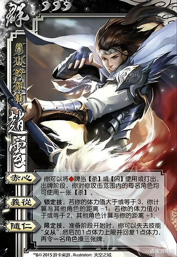 【随仁】:限定技,准备阶段开始时,你可以失去技能“义从”,然后加1点体力上限并回复1点体力,再令一名角色摸三张牌。 三技能【随仁】是限定技,失去“义从”回血并摸牌。技能名称和效果显然是赵云离开公孙瓒,追随刘备的典故。技能效果是简单的回血摸牌,注意摸牌可以选择队友,因此SP界赵云也具备一定的辅助能力!