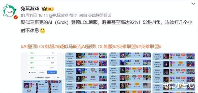 胜率高达百分之九十二,52胜4负,这样的天秀战绩,真的是人类打的出来的吗?最关键的是,这几乎是连续作战不休息的啊。也正是因为这一点,一时间,这位神秘高手就是AI的舆论就起飞了。也能够理解,毕竟看到对阵纪录之后,太佩服了,英雄池的深度那真的是和大海一样,MVP也拿到手软,现役选手中有这么变态的存在吗?加上其实在T1斩获S15冠军的时候,马斯克就放话,要用AI战队打败T1,终结T1王朝。这么一联想,这位高手是AI的概率确实更大了。