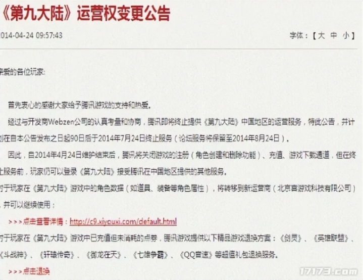 就在这一年,同样有无数网游玩家转头奔赴《英雄联盟》,已被竞品抢走大量用户的《第九大陆》,又进一步的流失了为数不多的用户。 左手握着《英雄联盟》,右手又捏着《剑灵》,此时的腾讯,显然已经不再那么需要《第九大陆》了。 互联网大厂都会给产品评级,以此来配套的相关资源。毫无疑问,《剑灵》拥有战略级的优先权,《第九大陆》在腾讯内部的权重已降到低点。所获得的宣发资源自然大打折扣。 至于《第九大陆》公测之后,版本滞后,氪金问题,在笔者看来,这些都不是导致《第九大陆》人气持续走低的关键原因。它只是失去了最重要的那部分价值之后,自然而然的被资本放逐。 最终,2014年4月,腾讯发布公告,《第九大陆》停运,从公测到停服,仅仅2年。