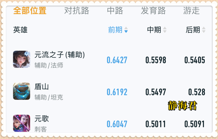严格意义上说,元辅并不能一楼直接选,但是如果我们把盾山ban掉,那问题就直接解决了。 新赛季的元辅非常非常强势,目前他在各个分段的胜率都远超第二名,其中全段位胜率是54.7%,比第二名高了2.1%;巅峰赛是56.7%,比第二名高了3.8%;顶端局是58.8%,比第二名高了5%。