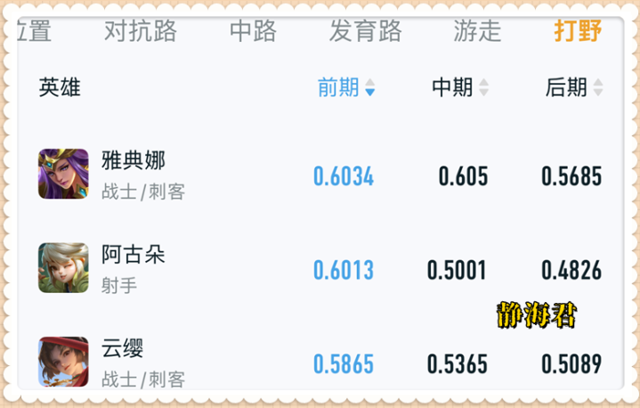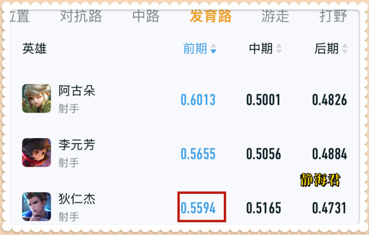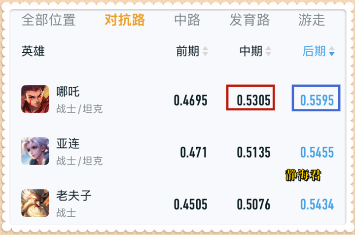 更关键的是,除了后期强度第一之外,哪吒在中期的强度也很高,0.5305的数据可以排到全对抗路第五。 简而言之,只要顺利度过前期,整个游戏就会进入到哪吒的节奏中去。