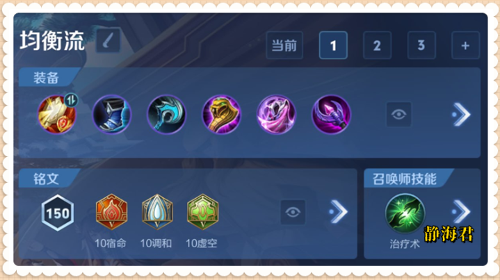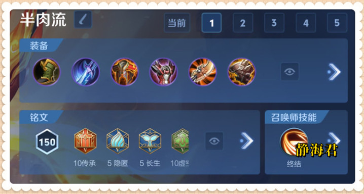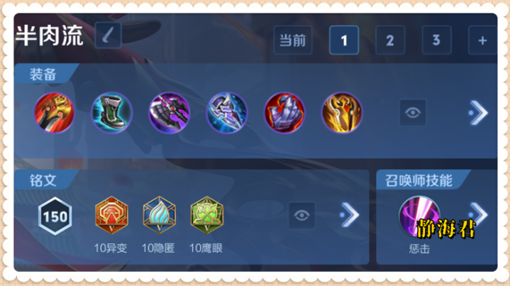 新开发的一套叫做瞬秒暴击流,具体出装是:贪婪之噬、抵抗之靴、暗影战斧、宗师之力、无尽战刃、破军。 这套出装的优势是爆发伤害极高,任何脆皮都扛不住;但缺点是实在太脆,对操作者的要求也比较高。 ③狄仁杰