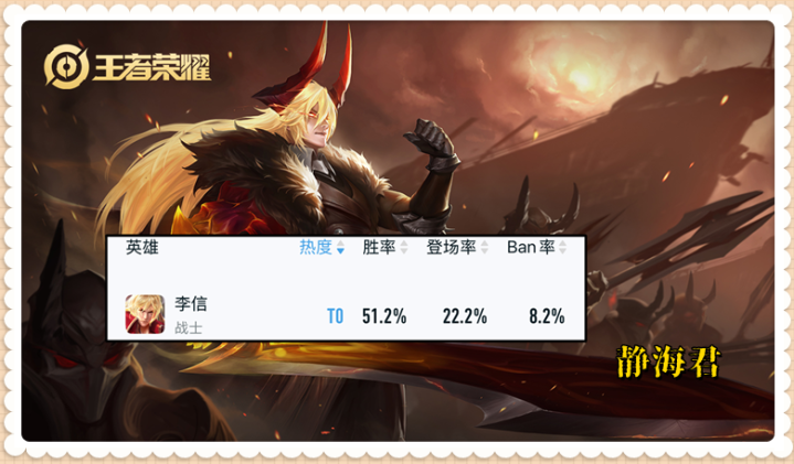 凭借51.2%的胜率、22.2%的出场率以及8.2%的ban率,李信成功晋升为新赛季对抗路热度最高的T0级英雄。 Ps:这里补充一点,王者营地评价的T0不光只看胜率,还会兼顾登场率和ban率。 作为一名战士爱好者,李信(暗信)一直是我的备选英雄之一,我个人认为李信的这次调整主打的是增加容错。 就不说变身的时候可以移动了,光是新增的神魔能量条以及技能ad加成的调整就让李信有了好几种完全不同的玩法。