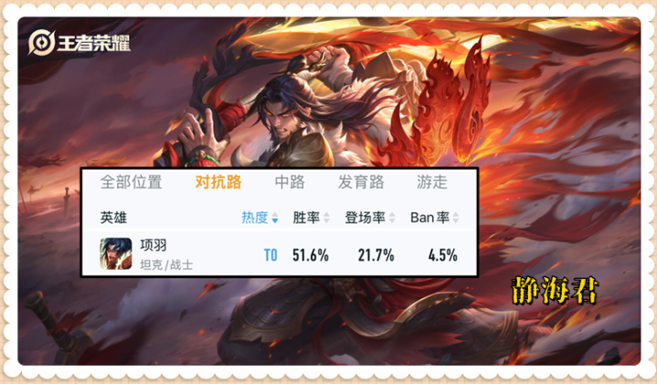 对抗路的第三个T0英雄是项羽,项羽目前的胜率是51.6%、出场率是21.7%、ban率是4.5%。 以我的个人体会,现在的项羽非常强,他的强主要体现在两个方面:在需要他控制、抗伤的时候,项羽有稳定控制、减伤,只要有他人,没人能靠近己方c位;在需要项羽打输出的时候,他又能一打n,残血状态下一个大招,甚至能团灭对面。