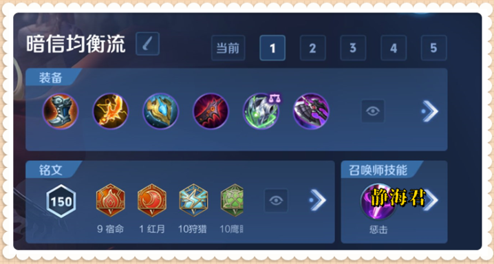 另外,我们还可以选择光信均衡流:制裁之刃、影忍之足、逐风、破军、永夜守护、暗影战斧。 说是光信均衡流,但因为我主玩暗信,所以实际上我还是偏暗形态比较多。这套出装的强势之处在于:在需要带线的时候,可以切换暗信;在需要守高地的时候,可以切换光信。