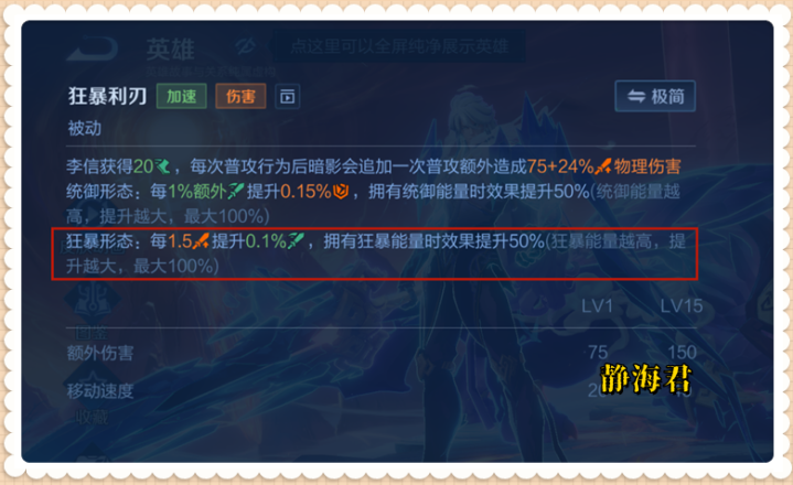 可能有小伙伴会奇怪,暗信不是需要攻速吗?这套出装除了制裁之刃和逐风有攻速加成以外,其他一点攻速都不加,这能行吗? 答案是能行,能行的原因有二:第一,暗信的被动让他每获得1.5点额外物攻,就可以提高自身0.1%的攻速(拥有狂暴能量时,效果还能再提升50%);第二,暗信主动技能的ad加成都改成了额外ad加成。 以破军为例,单是这件装备,就可以给暗信提高150点物攻、5%冷却缩减、破军被动以及10%的额外攻速加成。 补充:上述两套出装,前者打肉厉害一点,后者打脆皮厉害一点,大家可以根据对手的情况来做选择。 ②排名第二的T0