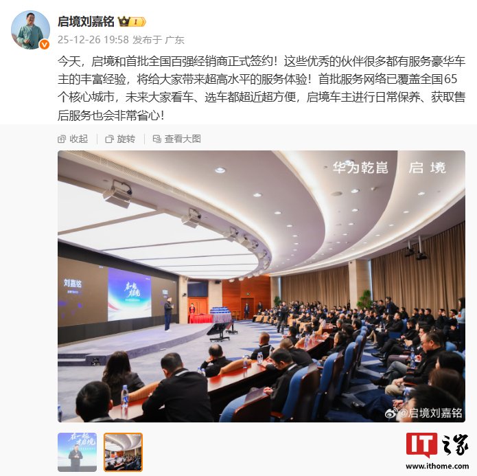 IT之家 1 月 15 日消息,华为乾崑“第一境”—— 华为与广汽联合打造的品牌“启境”首车已正式官宣。在去年 12 月,启境汽车 CEO 刘嘉铭就宣布,启境和首批全国百强经销商已正式签约,首批服务网络覆盖全国 65 个核心城市。