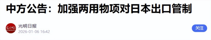 本文内容均引用权威资料结合个人观点进行撰写,文末已标注文献来源,请知悉。 自从中国实行军民两用物项出口管制之后,日本首相高市早苗的反应就让人感到很意外。 据新加坡联合早报1月11日报道,日本共同社报道,日本首相高市早苗在1 月11日播出的 NHK 节目中,用指责的口吻称:" 只针对我国(日本)的这次举措与国际惯例大相径庭,无法容许。"