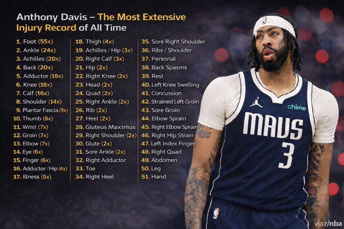 虎扑01月13日讯今日,美媒NBAMemes统计了安东尼-戴维斯生涯伤病汇总,开云具体如下: 1、足部(55次) 2、脚踝(24次) 3、跟腱(20次) 4、背部(20次) 5、内收肌(18次) 6、膝盖(18次) 7、小腿(16次) 8、肩膀(14次) 9、足底筋膜(9次) 10、拇指(8次) 11、手腕(7次) 12、腹股沟(7次) 13、肘部(7次) 14、眼睛(6次) 15、手指(6次) 16、内收肌/臀部(4次) 17、生病(5次) 18、大腿(4次) 19、跟腱/髋部(3次) 20、右小腿(3次) 21、髋部(2次) 22、右膝(2次) 23、头部(2次) 24、股四头肌(2次) 25、右侧脚踝(2次) 26、肋骨(2次) 27、脚跟(2次) 28、臀大肌 29、右侧肩膀(2次) 30、臀部(2次) 31、脚踝酸痛(2次) 32、右侧内收肌 33、脚趾 34、右脚跟 35、右肩酸痛 36、肋骨/肩部 37、个人原因 38、背部痉挛 39、轮休 40、左膝肿胀 41、脑震荡 42、左侧腹股沟拉伤 43、腹股沟酸痛 44、肘部扭伤 45、右肘扭伤 46、右髋拉伤 47、左食指 48、右股四头肌 49、腹部 50、腿部 51、手部 |